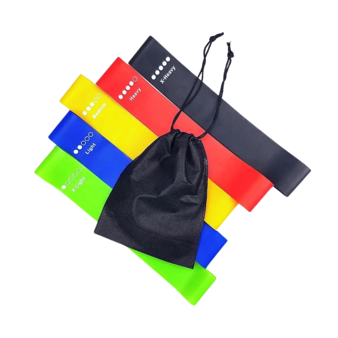 This 5-piece loop resistance band set includes five color-coded elastic bands with varying resistance levels, perfect for strength training, muscle toning, flexibility exercises, yoga, physical therapy, and full-body workouts.